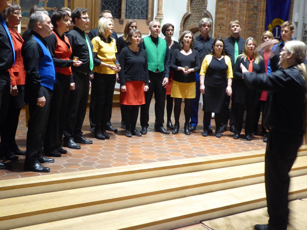 Letztmalig im Dezember 2023 sangen die beiden Kieler Chöre "Art de Chor" und "popchor à avocalo" mit jeweils rund 25 Mitgliedern insgesamt rund zweieinhalb Stunden unter der Leitung von Heiko Bilitewski und Norbert Markmann einen bunten Musik-Mix. Dabei spannte sich der Bogen von Medleys der Pop-Gruppe "Abba" und Klassikern der "Neuen deutschen Welle" über Stücke von "Eurythmics" und "Queen" bis hin zu Volksliedern wie "Es klapperte die Mühle am rauschenden Bach". Mal ruhig und sanft, mal kraftvoll und mitreißend ließen die Akteure nicht ein einziges Mal ein Musikinstrument missen. Es bot sich dem Publikum ein A-Cappella-Gesang auf hohem Niveau. In der Konzertpause konnte das Publikum Christstollen und warme Getränke zu sich nehmen. In einem großen Finale sangen beide Chöre mit dem Publikum das Weihnachtslieds "Oh Du Fröhliche ..." Die Publikumsresonanz war durchweg positiv. Vor der Kirche wurde in der Konzertpause ein reichliches Angebot an warmen Getränken sowie Stollen angeboten.