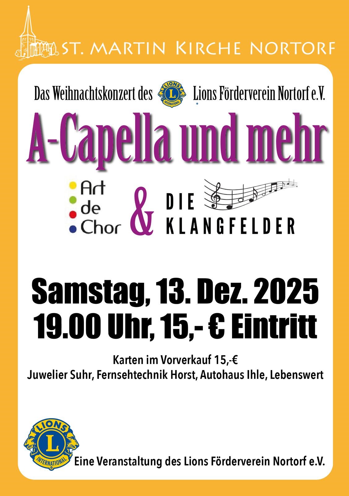 Wir vom Lions Club Nortorf freuen uns bereits jetzt auf das diesjährige Benefizkonzert, für das wir wieder den Kieler Chor "Art de Chor" sowie erstmalig den aus Felde stammenden A-Capella-Chor "Die Klangfelder" gewinnen konnten. Bis dahin wünschen wir Ihnen alles Gute.
